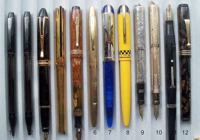 c. 1930s Gold Medal fp w/ bronze and black celluloid, unusual knurled ends, name in bbl, $125 |