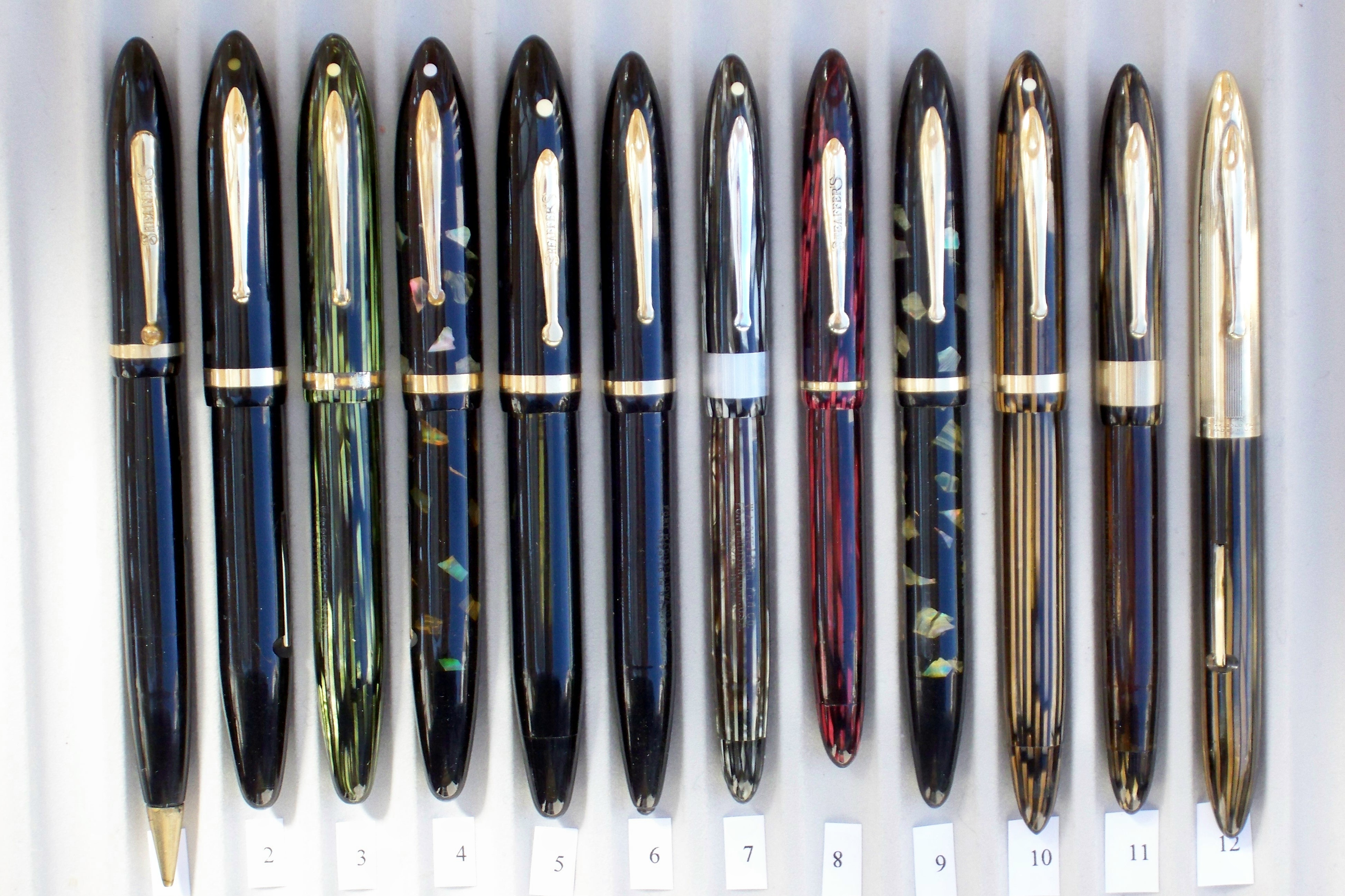| 3 | c. 1938 OS green striated Streamline pen, w/ink view section/two-tone F/M nib, repair to cap band, $185 |
